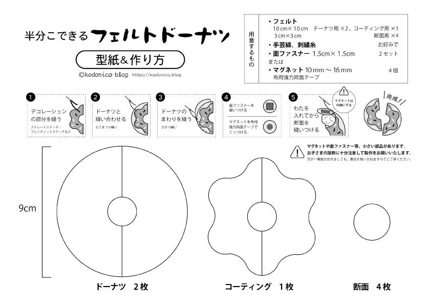 誤飲の危険を減らすために、マグネットは内側に布用強力両面テープで固定、面ファスナーはしっかり縫って固定するなど、安全面に気をつけて作ってください。